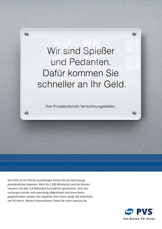 Zusammen mit unserer Partneragentur ROBOT sind wir seit 2011 für den Verband der Privatärztlichen Verrechnungsstellen (PVS) aktiv. Die Operation ist gelungen und beweist, dass B2B-Kommunikation nicht langweilig sein muss. Als erste Adresse für Privatabrechnungen (Honorarvolumen: 3,6 Milliarden Euro p.a.) sorgt die PVS dafür, dass Ärzte ihre Leistungen zuverlässig abrechnen können – was dem Verband fehlte, war emotionale Relevanz und Sympathie. In Workshops entwickelten wir eine Markenstrategie und sorgten für die kreative Umsetzung. Das Aufgabenspektrum: Brand Consulting, Beratung, Anzeigen und Markenfilm, Corporate Identity, Verkaufsliteratur, Homepage, Online-Kampagne und Musikberatung.